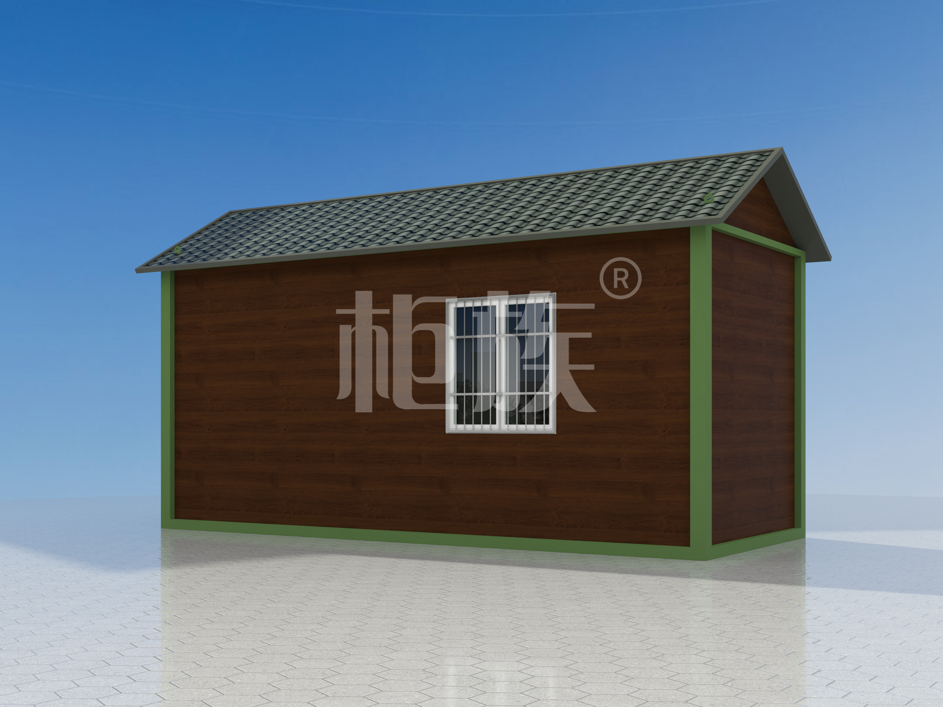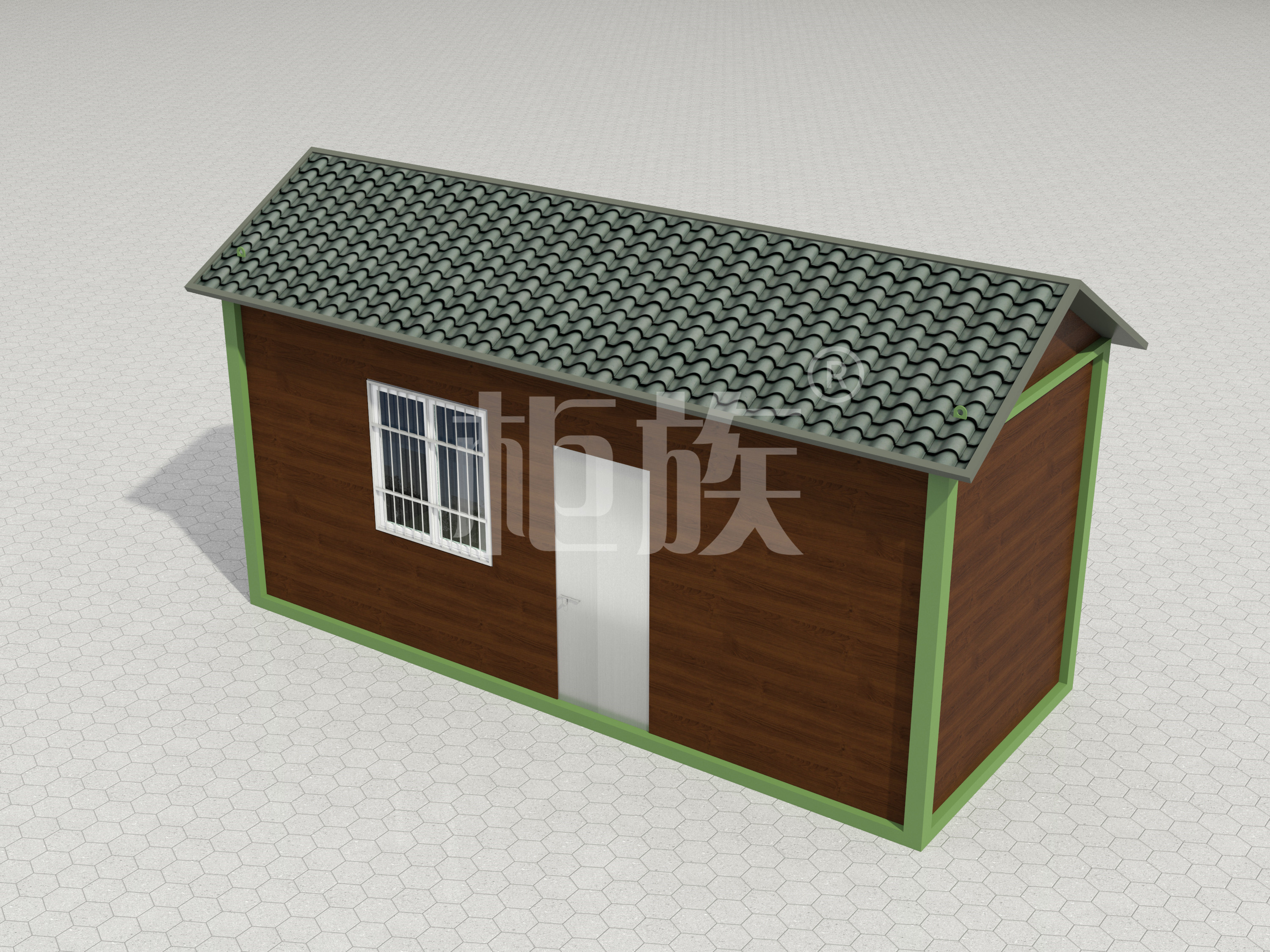 Galvanized rectagular steel tube frame, asphalt tile pitched roof, simply decorated wall. It is beautiful in appearance, good in windproof and moisture-proof, and can be used by fishpond breeding staff.